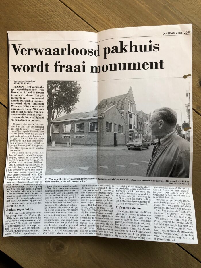Meer dan twintig jaar geleden, in 2002, werd het pand Kunst na Arbeid grondig gerenoveerd. Daarover schreef het Noordhollands Dagblad op 2 juli 2002 het artikel ‘Verwaarloosd pakhuis wordt fraai monument’. Sindsdien hebben er verschillende bedrijven in gezeten. Een kinderwagenwinkel, een antiekzaal/atelier, een lichtstudio, een financieel adviesbureau en nu dus een coworking space en praktijkruimte in Hoorn voor vergaderingen, lezingen, lunches en meer. Tevens een ideaal basisstation voor stadswandelingen door de binnenstad van Hoorn en vaartochten over het Markermeer. Meer over de geschiedenis van Westerdijk 52 leest u hier.