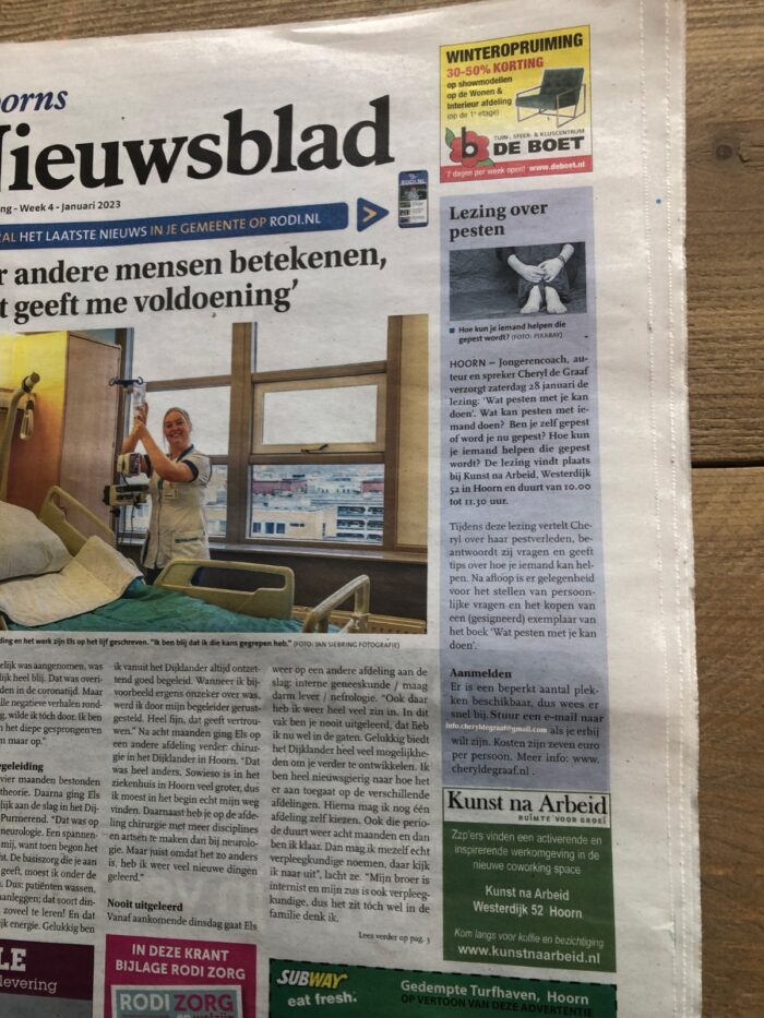 Zoals gezegd, staat coworking space Kunst na Arbeid ook open voor lezingen, presentaties, vergaderingen, workshops en meer. Hieronder op de voorpagina van het Hoorns Nieuwsblad een aankondiging van een lezing over pesten door Cheryl de Graaf.