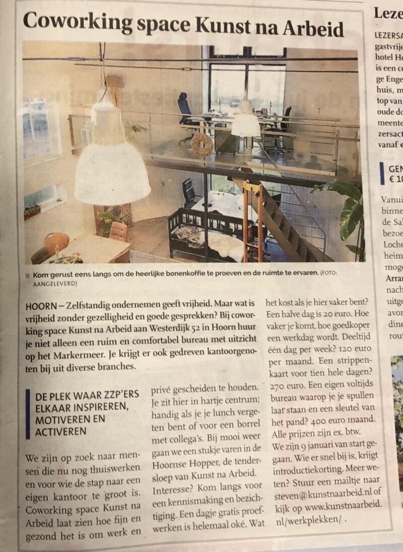 Eerder, op 7 januari 2023, scheef het Noordhollands Dagblad over de nieuwe coworking space in Hoorn. Diezelfde dag verscheen er ook een stukje over op de website van de krant.