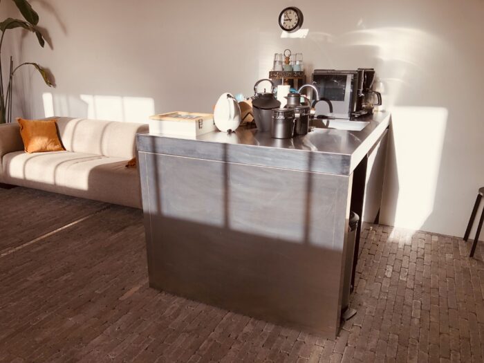 Coworking space Kunst na Arbeid in Hoorn is meer dan een kantoor. Foto’s van keukenblok, koelkast, koffiezetapparaat, zitbank, etc