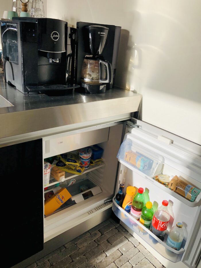 Deze koelkast moet nog beter ingericht worden. Maar de boodschap is helder: hier kun je dranken en eten koel bewaren. Handig als je de ruimte een heel weekend afhuurt.