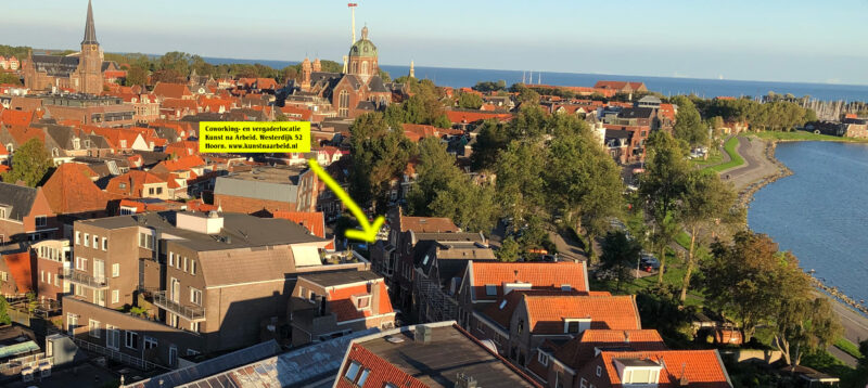 Bij coworking space Kunst na Arbeid kom je natuurlijk om geconcentreerd te werken. Maar, zoals je op deze foto vanuit de lucht kunt zien: de omgeving nodigt uit voor een heerlijke wandeling langs het nieuwe stadsstrand en over de boulevard. De gele pijl wijst naar Westerdijk 52, Hoorn. Wil jij hier ook werken? Stuur ons dan een mailtje om te informeren of er nog bureaus vrij zijn.