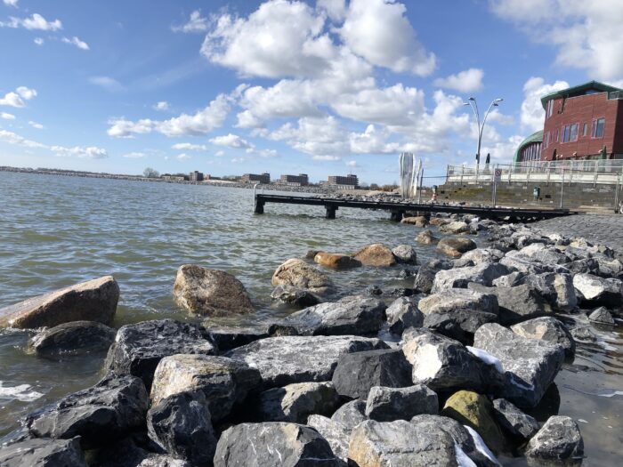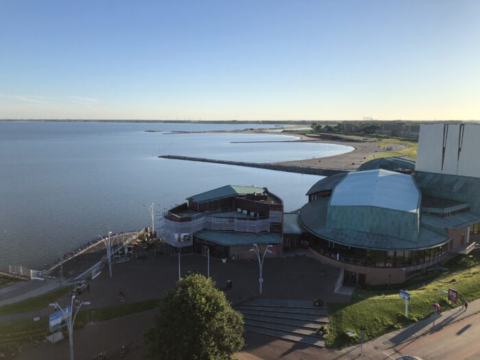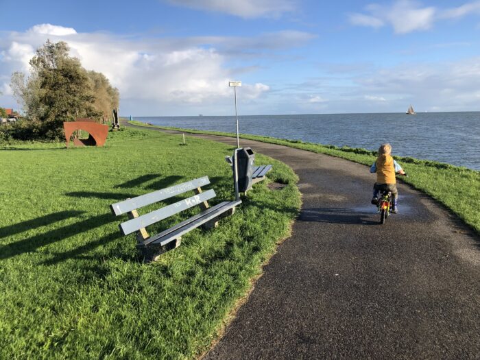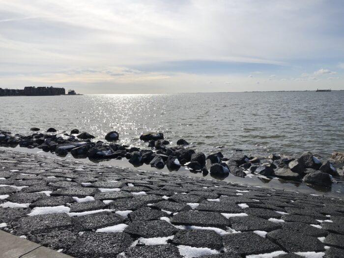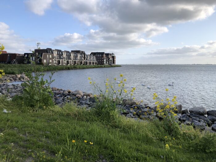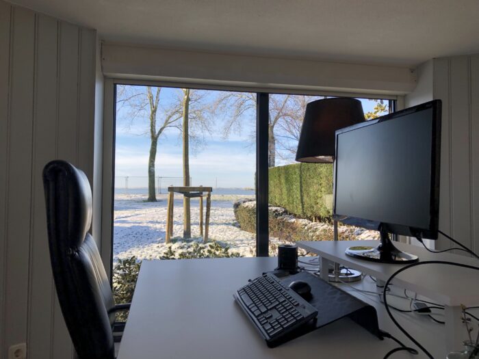 Werkplek in coworkingspace Kunst na Arbeid. Uitzicht over het Hoornse Hop, Markermeer.