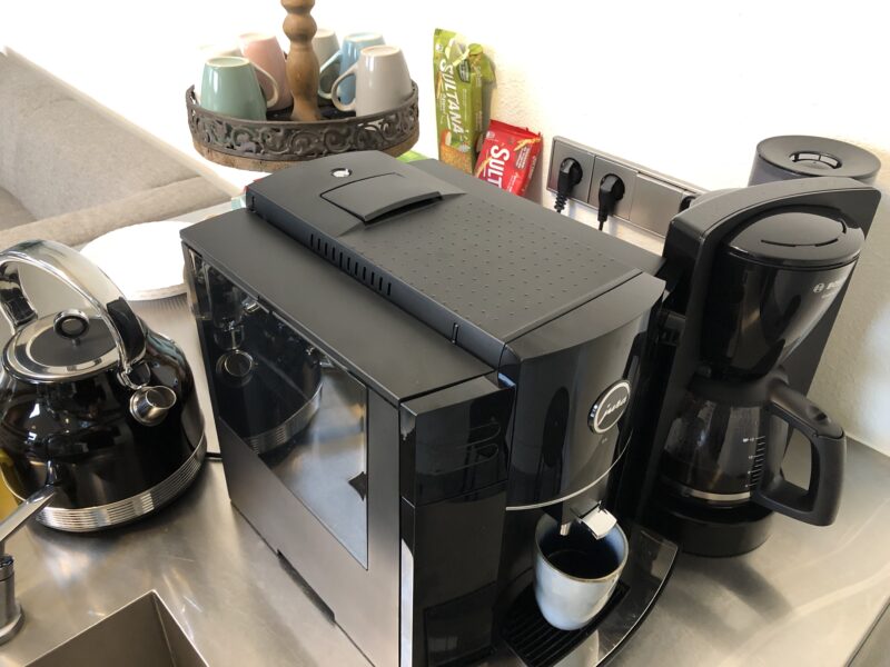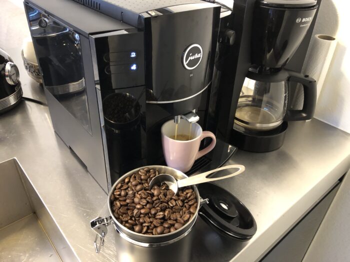 In de horeca reken je per kopje af, maar bij coworking space Kunst na Arbeid doen we net alsof we een echt kantoor zijn. Alles inclusief dus! Koffie, thee, versnaperingen. Voor de fijnproever is er heerlijke bonenkoffie uit de onvolprezen en gloednieuwe Jura D4 Piano Black. Weliswaar klinkt die machine als een houthakselaar, maar de smaak compenseert dat euvel. En aan het geluid wen je zo.